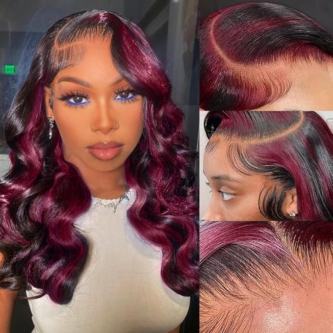 Skunk Stripe Wig Red With Black Highlights Body Wave Lace Front Wig Human Hair 13X4 HD Lace Front Wig Burgundy Colored Body Wave Wigs Pre Plucked With Baby Hair 150% Density Natural Hairline 16inch
