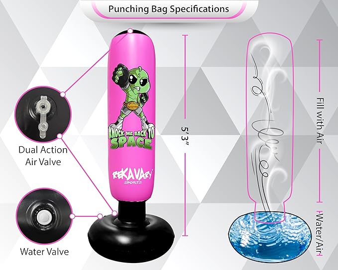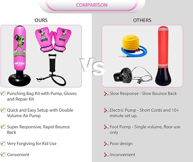 - Double Action 2X capacity Air Pump included - Inflate the kids ninja punching bag in half the time with ease. The included Dual Action Super Air Pump makes inflating fast, easy and simple in under 60 seconds. Dual Action hand pump easily inflates the inflatable punching bag on both the up and down pump unlike the issue prone electric pumps that are hindered by their short cords, the need to be near an outlet, the lack of power outlets where you need them making electric air pumps inefficient.