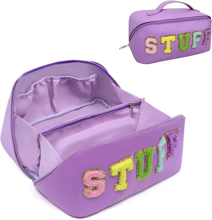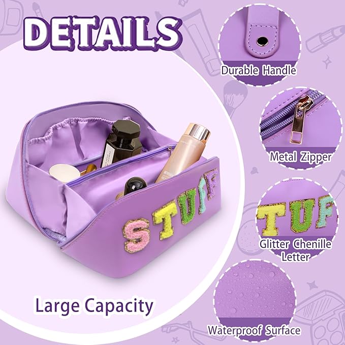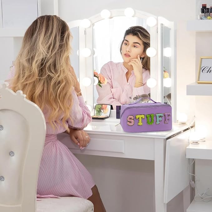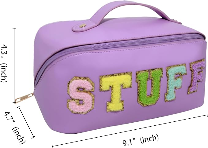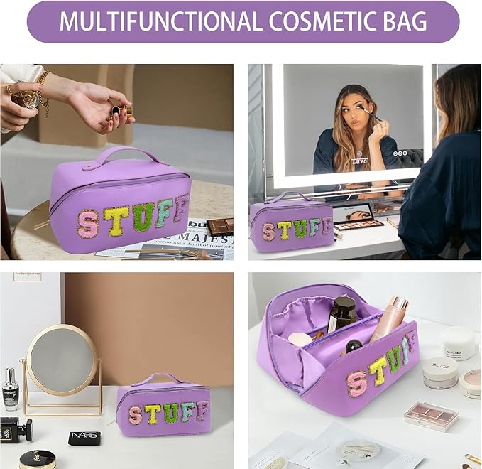 - 【GLITTER CHENILLE LETTER MAKE UP BAG】The flat makeup bag has a large opening design for quick access to items, making it a must-have bag for travel.Easy to pick up,the top comfortable handle is convenient to carry,unique chenille letter design, exquisite and trendy