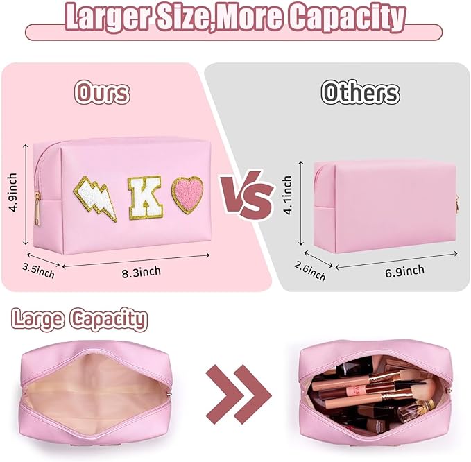 - 【Large Capacity】 Upgrade large letter makeup bag is spacious, the size of the toiletry bag is approx. 8.3x 5.1x 3.5 inch, roomy interior organization enough to hold your everyday beauty essentials for taking on trips, sleepover, or touching up throughout the day. A good helper for you organizing cosmetics and preventing loss.