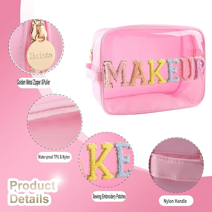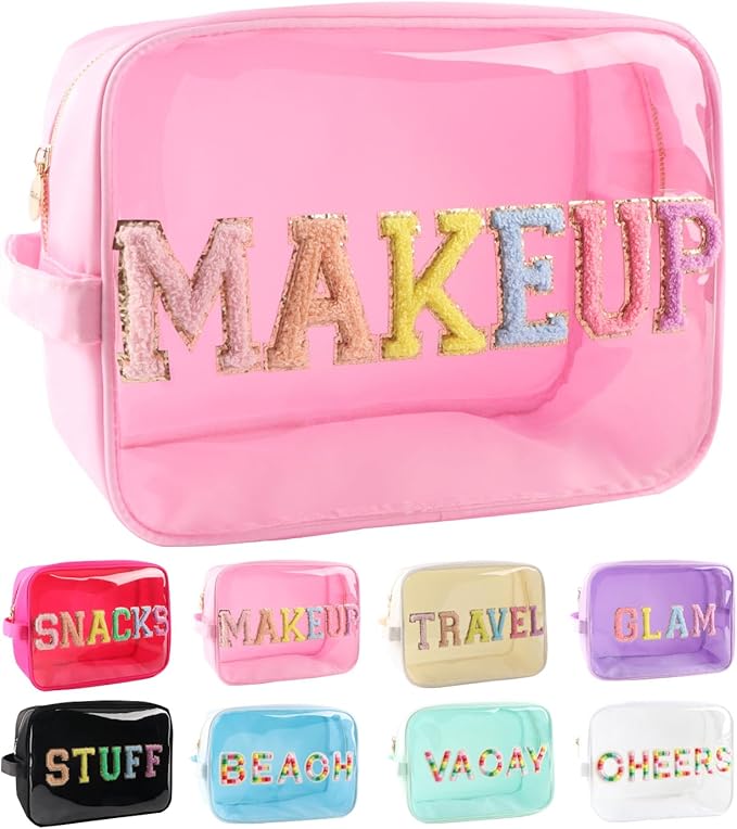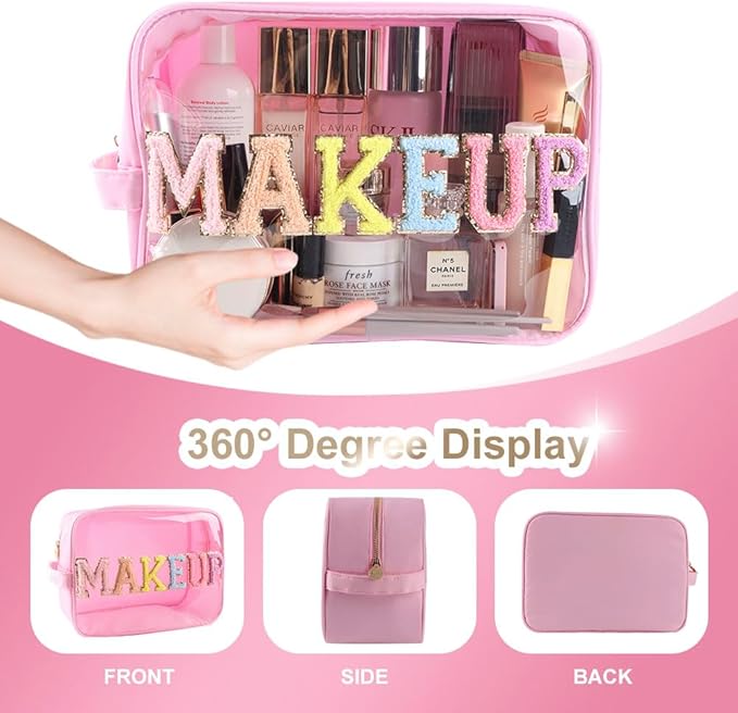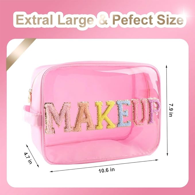 - 【Glitter Chenille Letters MAKEUP Patches Sewn】Transparent makeup bag with Glitter chenille letters MAKEUP Patches sewn on TPU front for new trendy looks, not stick, so will be stayed on them always.
