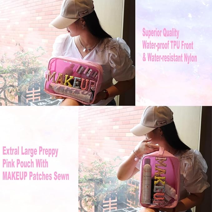 Large Clear Glitter Patches MAKEUP Pouch Preppy Transparent TPU and Nylon Cosmetic Bag Women (Pink-Makeup)