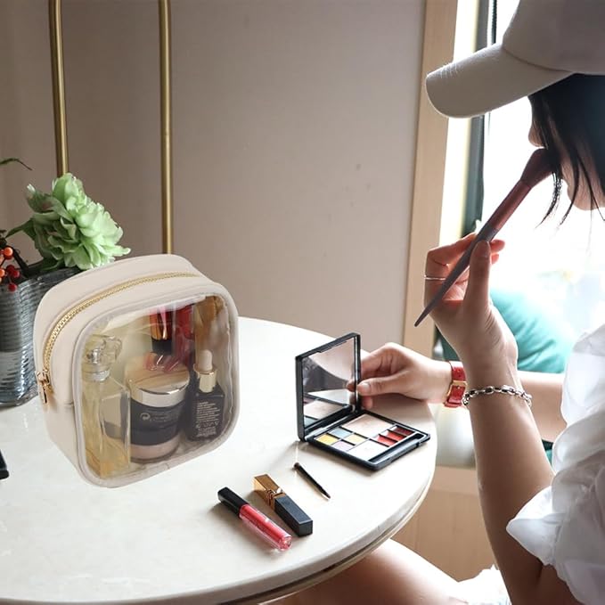 Small Preppy Clear Cosmetic Pouch Women Travel Mini Transparent TPU and Nylon Makeup Pouch(Small, Beige)