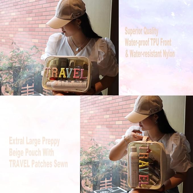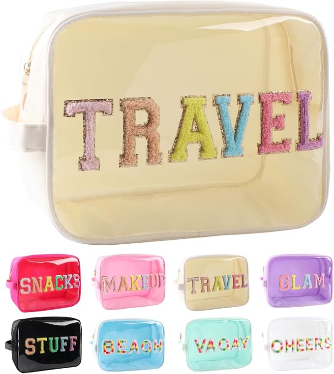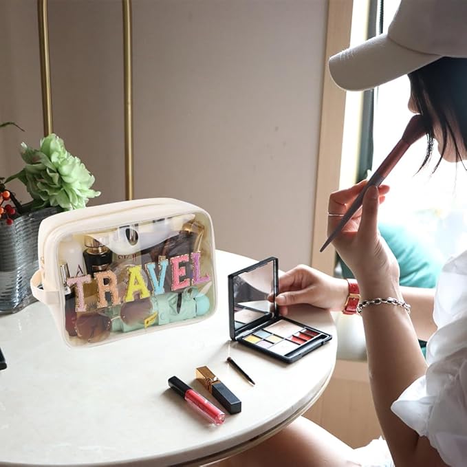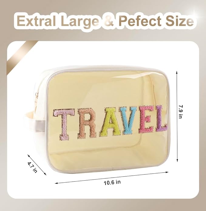 - 【Glitter Chenille Letters TRAVEL Patches Sewn】Transparent makeup bag with Glitter chenille letters TRAVEL Patches sewn on TPU front for new trendy looks, not stick, so will be stayed on them always.