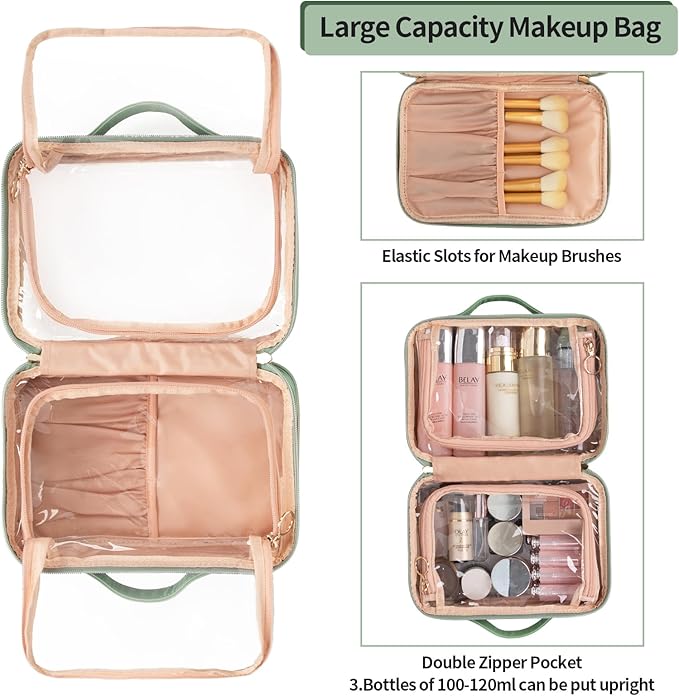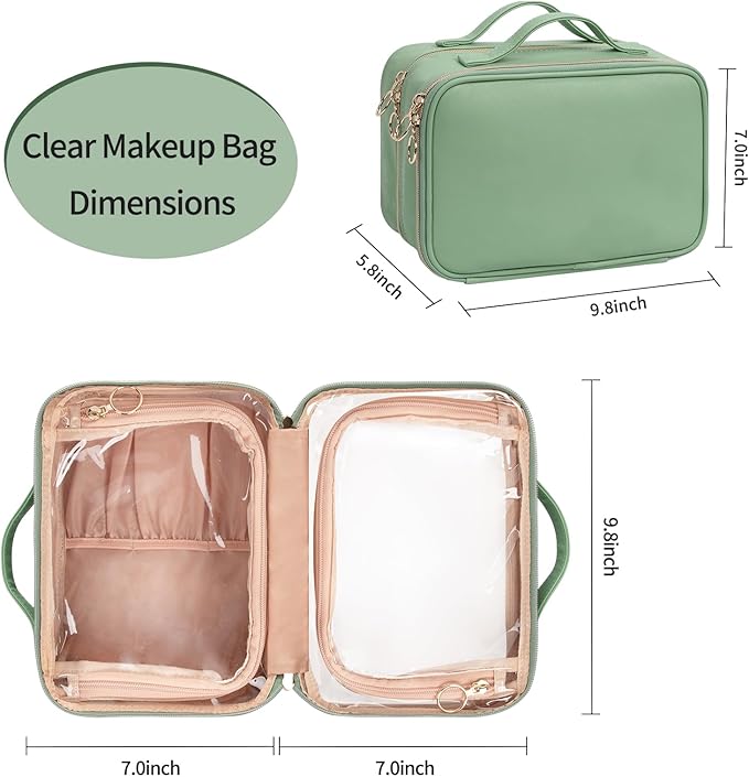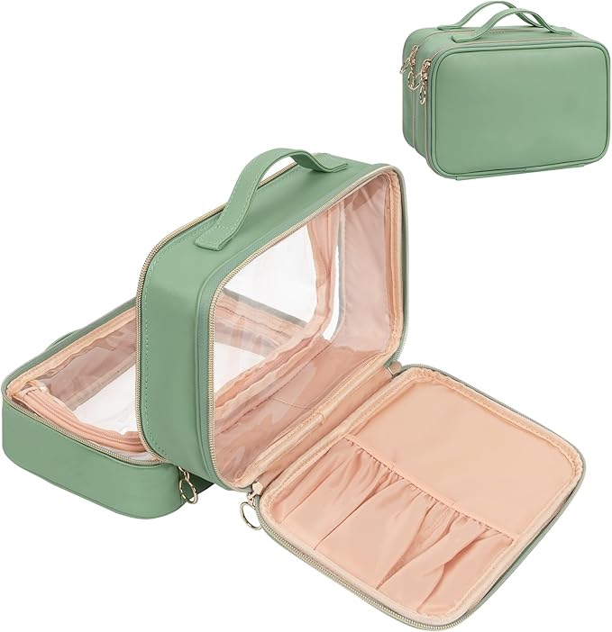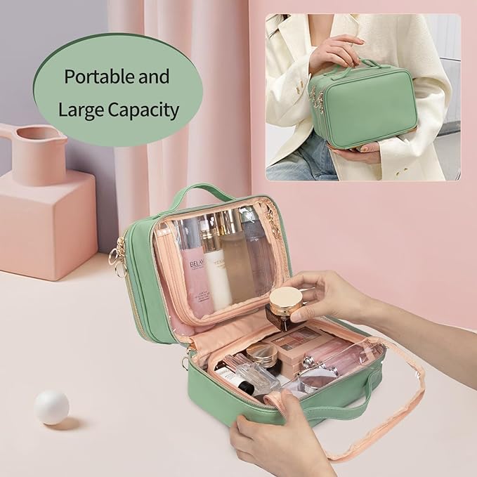 OCHEAL Makeup Bag, Double Layer Cosmetic Bag, Large Capacity New Look Clear Cosmetic Case for Women Travel Beauty Essentials, Multiple Compartments Makeup Case Organizer Zipper Pouch -Light Green