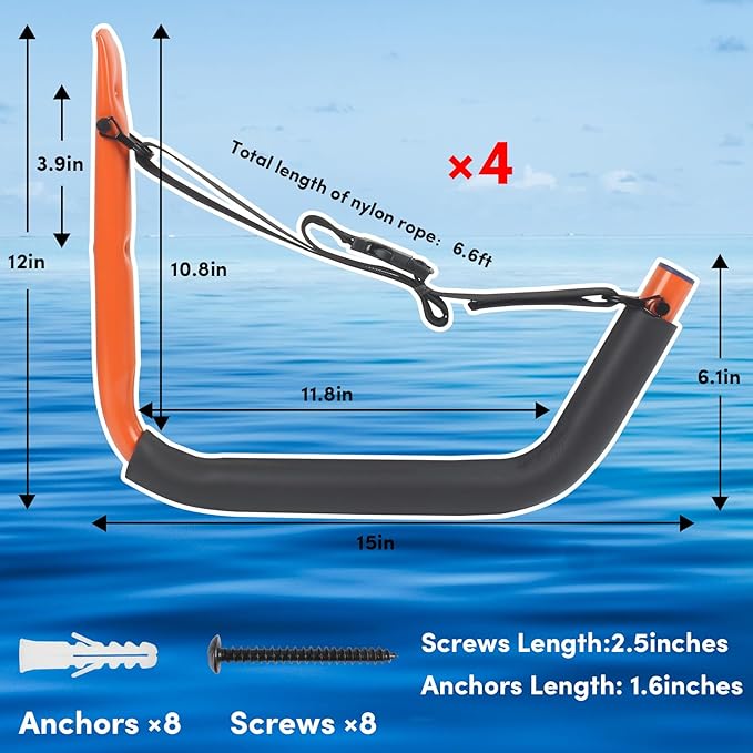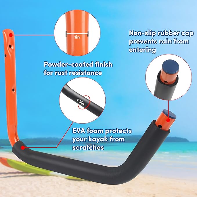 - 【Safe and Reliable】 Each kayak wall rack has a 5mm thick EVA foam protective pad to protect your kayak or stand-up paddle boards from damage due to storage. The 6.6 ft nylon strap and clip included with the garage kayak mount ensure that your kayak is securely secured in place and not easily detached. The sharp edges of the kayak storage rack are covered with rubber, hiding the sharp parts to make it safer and prevent rainwater from entering.