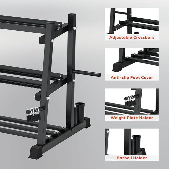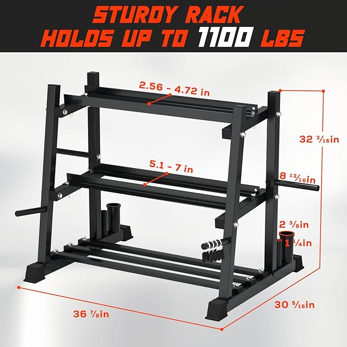 - MULTIFUNCTIONAL WEIGHT RACK: Our dumbbell storage rack, with adjustable tiers, weight plate storage bars, and barbell holders, provides versatile storage for a wide range of dumbbells, kettlebells, barbells, and weight plates