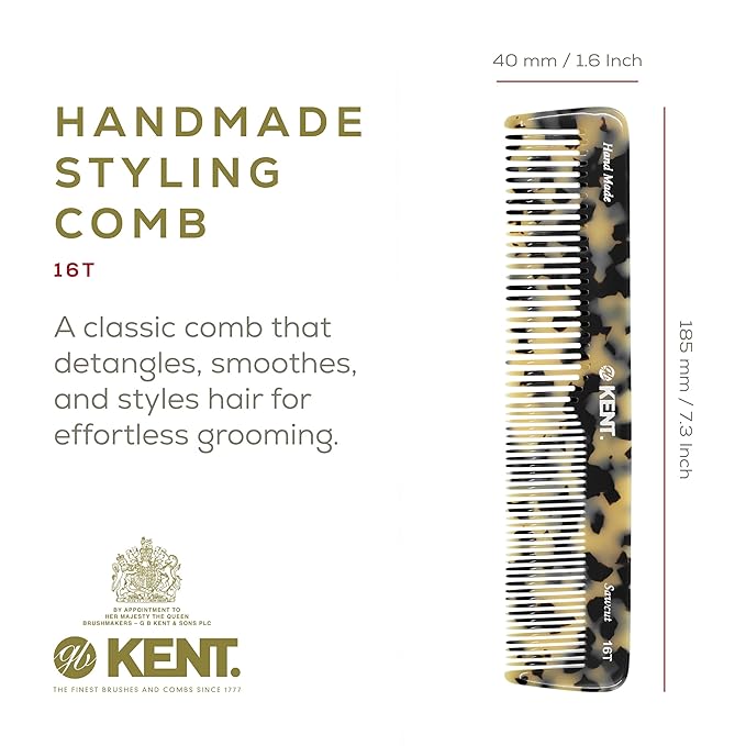 Kent 16T TW Fine Tooth and Wide Tooth Comb for Daily Grooming, Handmade Styling Comb for All Hair Types, Styling and Detangling Combs for Men and Women
