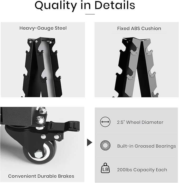 - Maneuverable Sturdy Wheels: Each wheel with a diameter of 2.5” and 200lbs capacity enables the rack to hold up to 700LBS. 360-degree swivel wheels enable quiet and smooth rolling even with heavy load on it, making it extremely easy to slide anywhere you want. Protected by a PU layer, wheels roll silently with lifetime durability. Two of the four casters also have an integrated brake to keep the dumbbell rack in place.