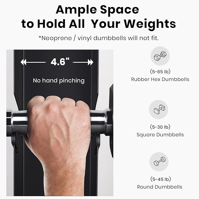 - Maximum comfort: Having proper spacing between slots is important when it comes to comfort and convenience. The rack has a spacing of 4.6 inches between each slot, carefully designed to provide enough room for easy and comfortable placement of dumbbells without the risk of pinching your hands.