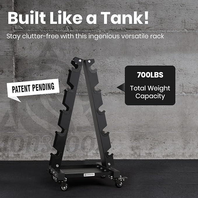 - Versatile, Stable and Durable as You Expected: Patent-pending design of the innovative combination of the bottom tray, the wheels and the rack, it is a perfect A frame dumbbell rack to meet your needs. Made of heavy-gauge steel and with a 700LBS total weight capacity, it can withstand weights for years to come. This rack is tailored for medium to large dumbbells. The spacing of each slot is 4.6”, but considering the space between slots, we suggest comfortably racking at most 45lb, 50lb, 55lb, 60lb and 65lb rubber hex dumbbells on both sides. Neoprene/vinyl dumbbells are not suitable for it.