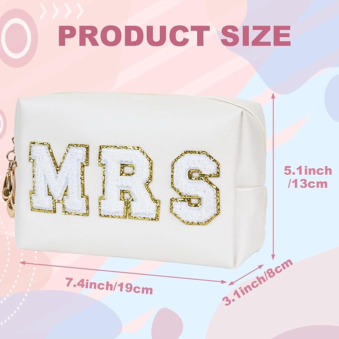 - 💄Beautiful and Elegant Design: The preppy makeup bags adopt soft white and pink color, and has a big “MRS” letter with gold trim is stuck in the middle letter in the center. It exudes an overall sophisticated and refined look,letter patch on the front, and gold plated alloy zipper. White is a symbol of purity, which is a good choice as a gift for your bridesmaid with this bag.
