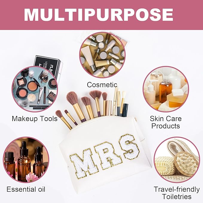 Bride Gifts MRS Patch Travel Makeup Bag Varsity Letter Cosmetic Toiletry Bag Letter Patches White Makeup PU Bag Bride Clutch Purse Waterproof Portable Zipper Organizer