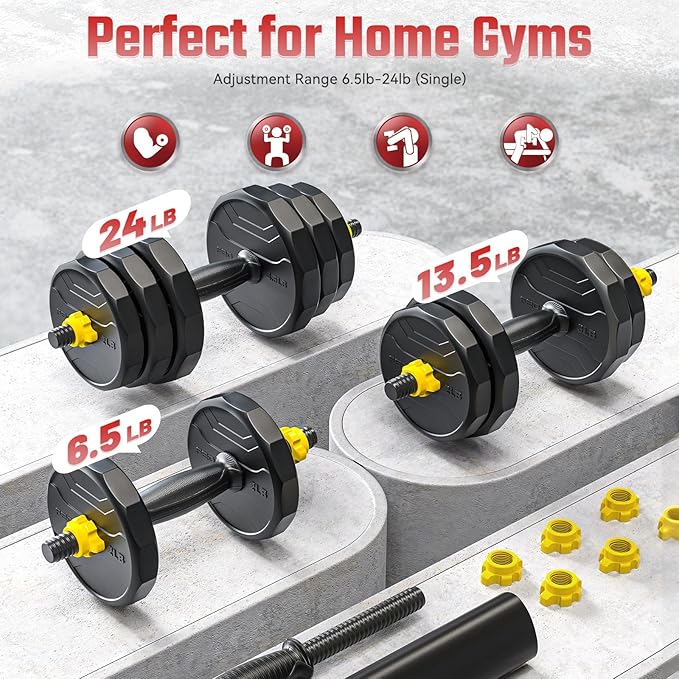- 【Perfect for Home Gym】Customize your workout with adjustable weights: dumbbells from 6.5 lbs to 24 lbs, kettlebells from 3.5 lbs to 23.5 lbs, and barbells from 6.5 lbs to 48 lbs. Create a complete home gym in less than 2 square feet of space with the freedom to mix weights as needed.