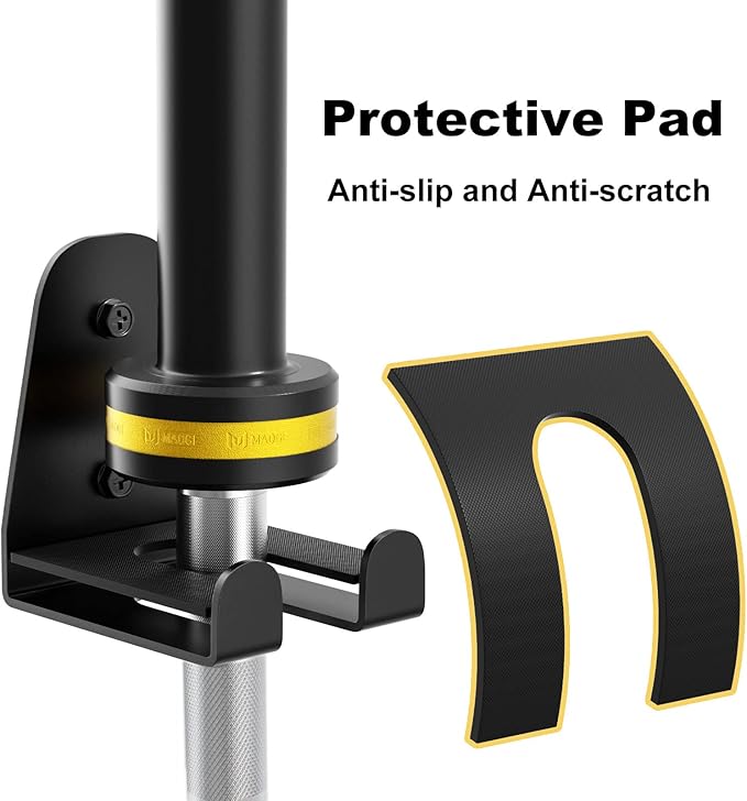 - Protective Pad Designed - The barbell hanger is sprayed with a matte matte anti-rust layer and comes with a rubber pad to protect your barbell coating.The surface is smooth and durable against rust.Provides good care for your steel bars, and you can use them for a long time