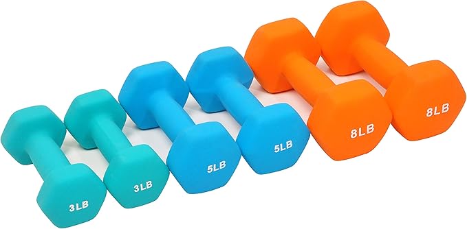 - 3 pairs of dumbbells in 3-pound, 5-pound, and 8-pound sizes. Ideal for resistance and other trainings