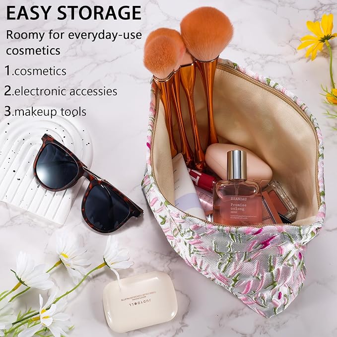 - Large Capacity:Our flower makeup bag measures 10.6×7.1×2 inches, easy to carry. This flower cosmetic bag can hold small items such as makeup, skincare products, lipstick, eye shadow, eyebrow brush, etc. The makeup bag has a large capacity and folds up conveniently when not in use.
