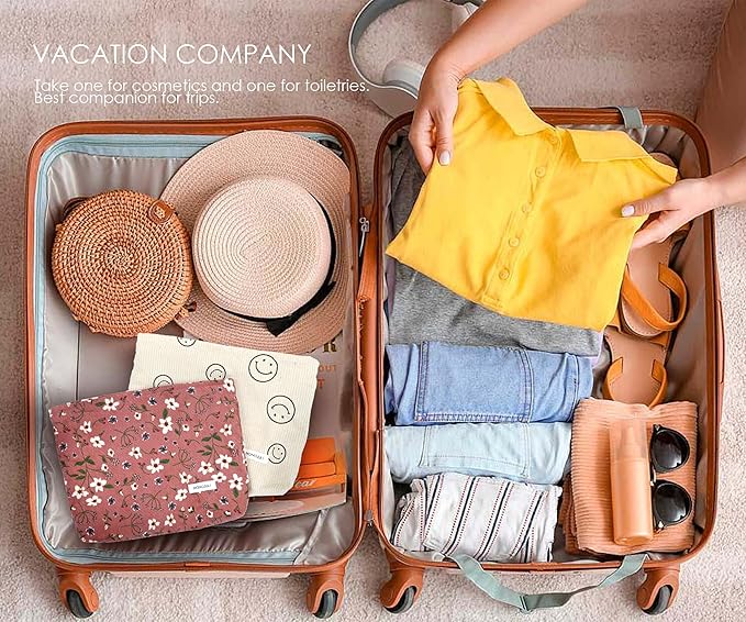 Corduroy Makeup Bag Cosmestic Bag Large Capacity Ladies Women Aesthetic Make Up Organizer Accessories Zipper Pouch Purse (Beige+Pink Flower)