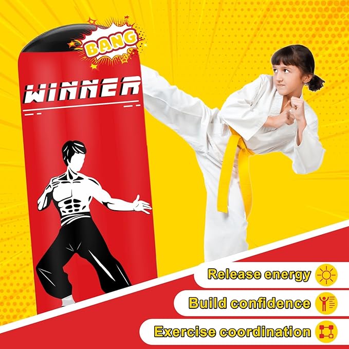 - A FUN TOY FOR KIDS: This inflatable punching bag is tailored for kids age 5-12, not only allows children to practice karate and taekwondo, the cute shape and design can also be used as a game prop and decoration for children's birthday parties.Let the children exercise while playing, improve the child's reaction speed and release pressure