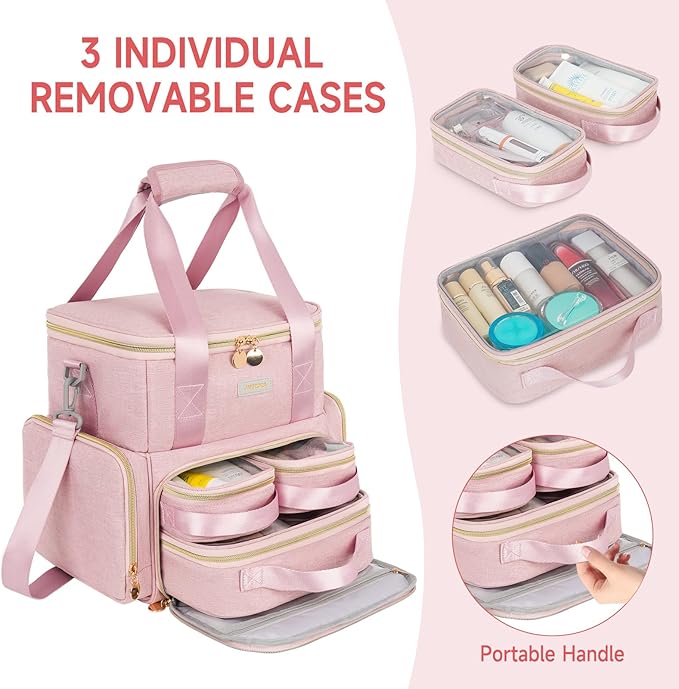 Extra Large Makeup Bag,4 in 1 Cosmetic Storage Organizer Travel Case with Detachable Pouches and Dividers,Pink