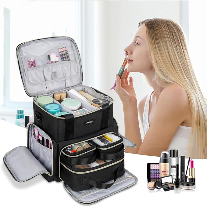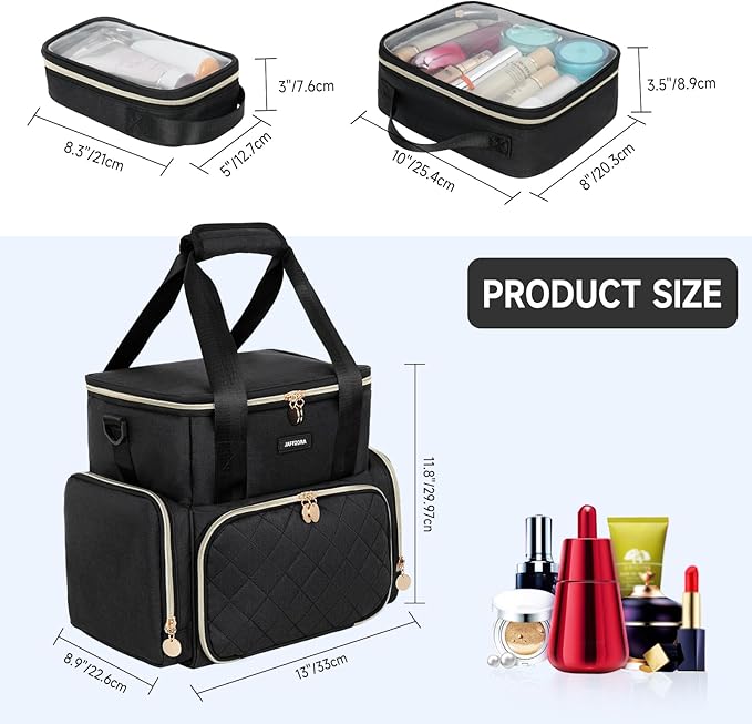 - Large Capacity: This travel makeup bag features a double layers, there is plenty of room for storing makeup on a daily basis. The upper compartment designs with 2 detachable dividers to keep your makeup and skincare products organized.