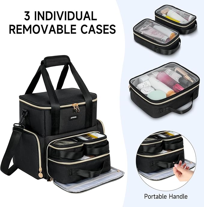 Extra Large Makeup Bag with 3 Removable Cases, Double Layers Travel Cosmetic Storage Organizer Bag with Detachable Dividers, Black