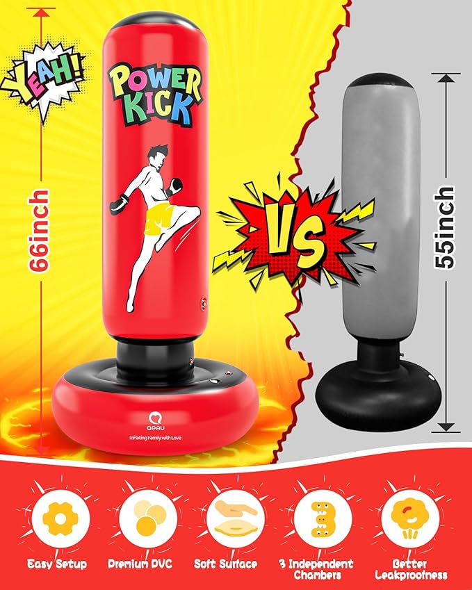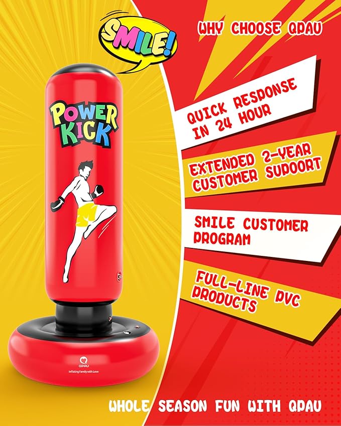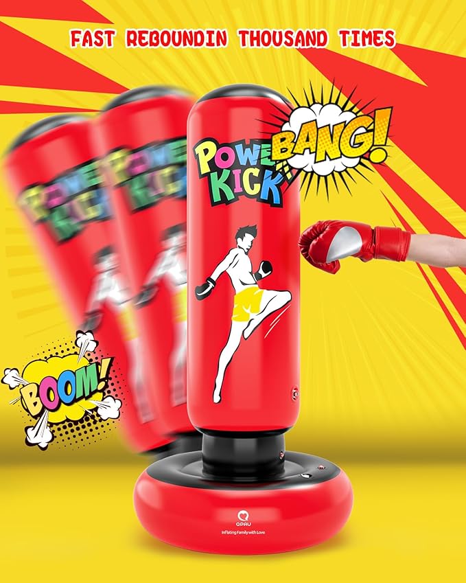 - FAST REBOUND: QPAU punching bag for kids provides a friendly boxing experience. No matter how forcefully you punch or kick the inflatable punching bag, it will immediately rebound thanks to the three separate air chambers.