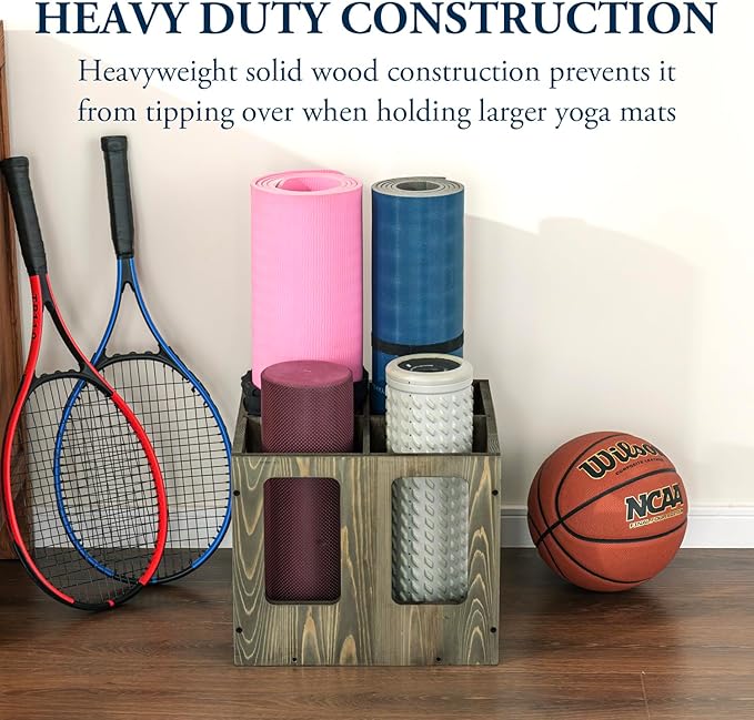 - Versatile hanging or freestanding square-shaped wooden storage rack with a vintage gray finish for organizing and storing gym accessories and mats **Some assembly required**
