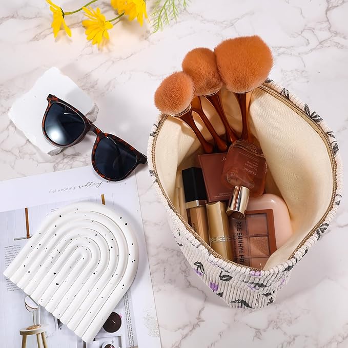 - Light Weight and Excellent Workmanship: This flower makeup bag is made of corduroy, soft and lightweight.The flower makeup bag can fold up when not in use and fits in a large bag without taking up space. The metal zipper pull keep your items secure and organized inside