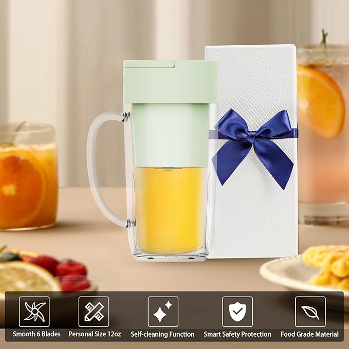 - 【Multifunctional - Practical】12 oz personal blender with handles, easy to carry, and meet your needs, turn normal drink into a good to-go mixed beverage. Colorful box packing makes it is a great gift for families, lovers, friends, colleagues, etc. What You Get: 1 X Portable Blender, 1 X Type-C Charging Cable, 1 X Straw, 1 X User Manual, 1 Year After-sales Service.