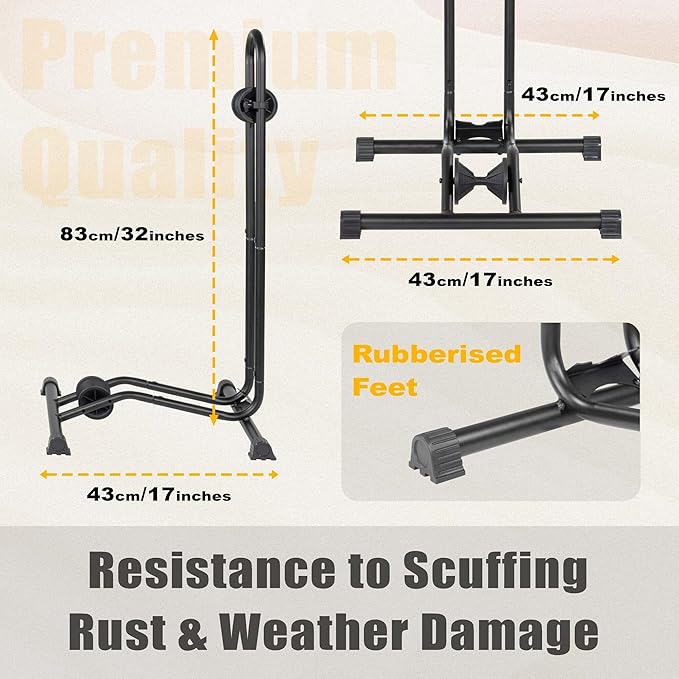 - PREMIUM DURABILITY - Crafted from powder-coated, high-quality solid steel with anti-rust coating, our bike floor stand ensures durability and stability. It resists scuffing, rust, and weather damage, ensuring a long lifespan. The rubber-protected base and precision-machined joints further enhance its stability, making it perfect for indoor use. This bike floor stand weighs 1.96 kg (4.35 lbs), providing a reliable and long-lasting solution to keep your bike safe and accessible.
