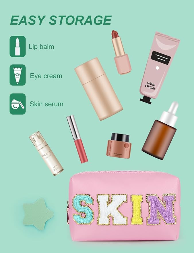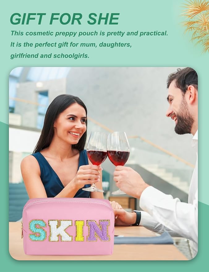 - ★GLITTER LETTER DESIGN - The patch makeup bag features vibrant "SKIN" chenille letters with gold trim on one side, securely sewn onto the bag for long-lasting appeal