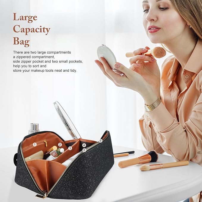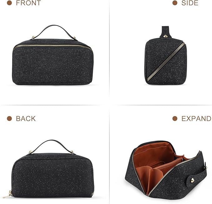 - Large opening design with zipper,easy access to your cosmetics.Inside the bag,there are two large compartments and a zippered compartment,help you to sort and store your makeup tools neat and tidy.