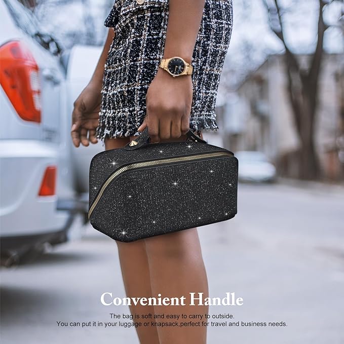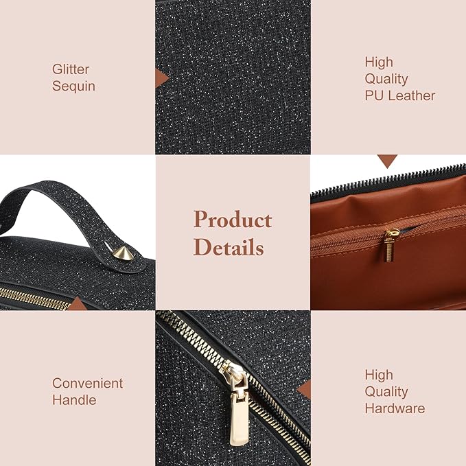 - This makeup bag is made of high quality PU leather,decorated with glitter sequin,soft and comfortable touch feeling,convenient handle and zipper design,prevent your cosmetic items getting wet and dirty.