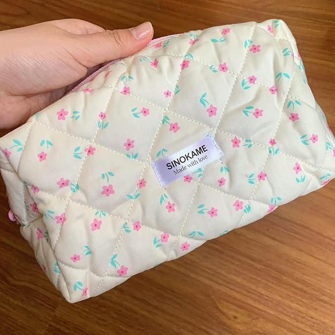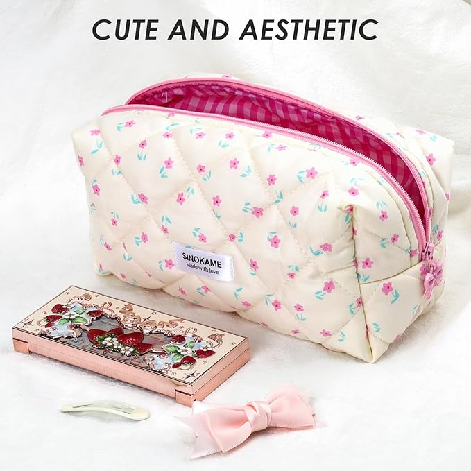 - CUTE AND SPACIOUS: These cute cotton quilted comsetic bags in pink floral patterns add a girly touch to your day, complemented by a soft, clean aesthetic. Measuring 8.3'' x 3.9'' x 3.9'' / 21x10x10cm, they offer ample space for essentials like makeup, skincare, and more, fitting perfectly in your big tote backpack