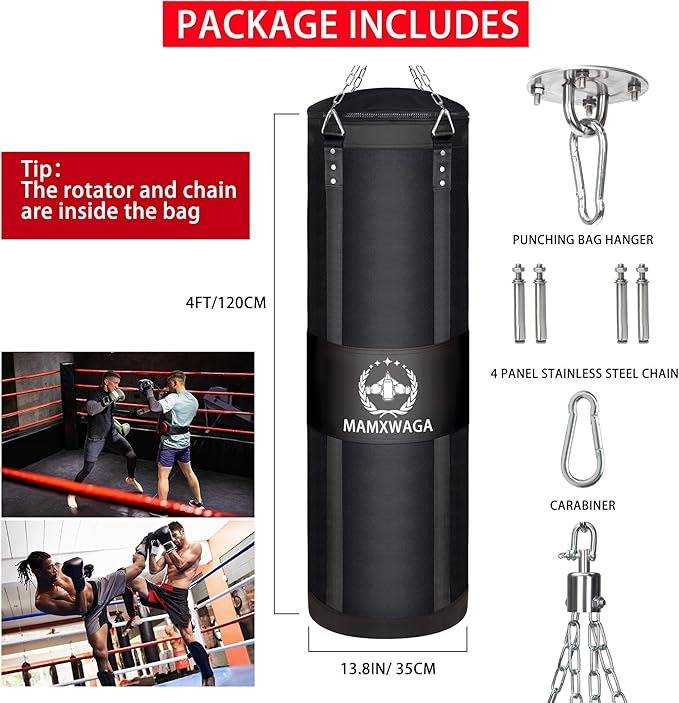 - 360° Swivel Steel-Hanger: 360° swivel Hanger allows the bag to rotate freely without knotting after impact. Equipped with 4 expansion bolts and a carabiner, easy to assemble, it can hold up to 1200LB!