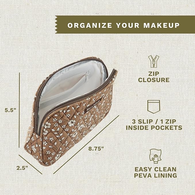 Bella Taylor Large Quilted Cotton Makeup Pouch for Women, Travel Cosmetic Bag, Quilted Cotton Vintage Vine Brown Floral