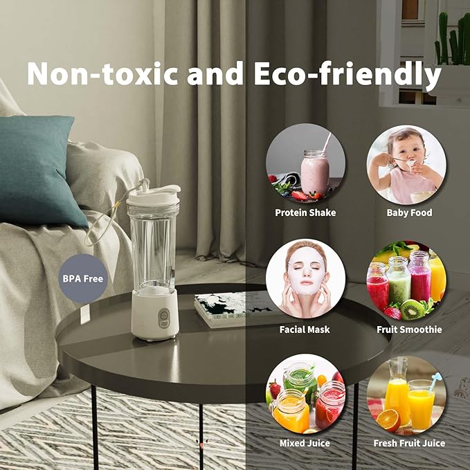 - 【Easy to Charge and Portable】The portable USB blender comes with a built-in 2x2000mAh rechargeable battery that works with all USB ports, including cellphones, computers, laptops and other USB devices. It is compact and portable enough to put in your backpack when traveling. Suitable for indoor and outdoor activities, travel, work, everything with you!