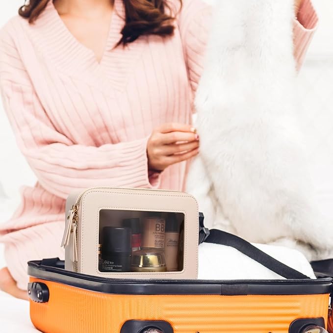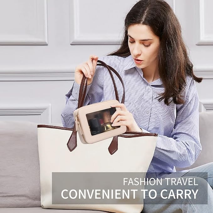Clear Makeup Bag Transparent Travel Case for Cosmetics and Toiletries Women's Brush Bag and Clear Car Bag with Zipper (Beige, M+)