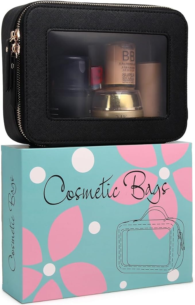 - [Sturdy makeup bag] : Made with the same durable Faux Leather inside and outside, along with a metal zipper, ensuring this clear cosmetic case retains its shape and effectively protects your belongings. It is also easy to clean with a damp cloth or wet tissue.