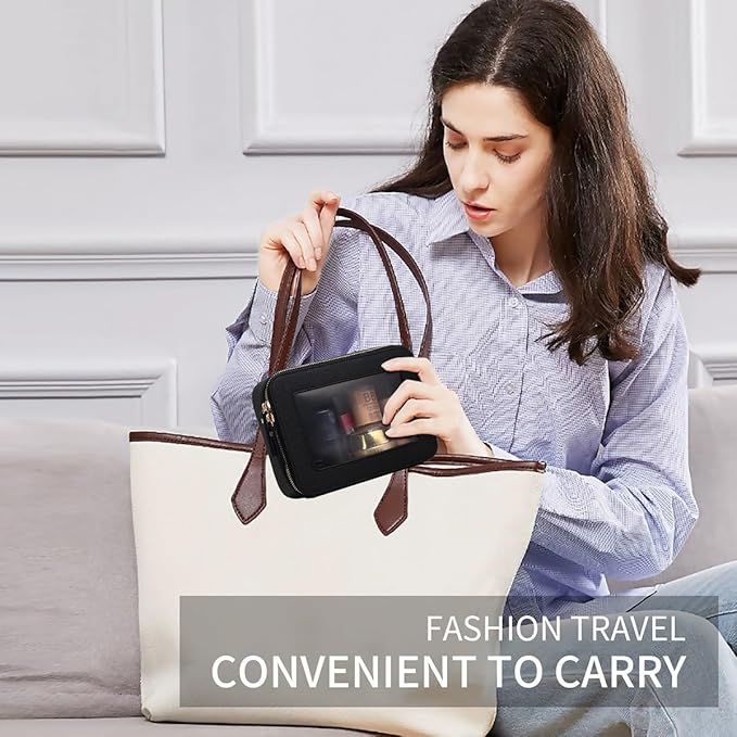 Clear Makeup Bag Transparent Travel Case for Cosmetics and Toiletries Women's Brush Bag and Clear Car Bag with Zipper (Black, M+)