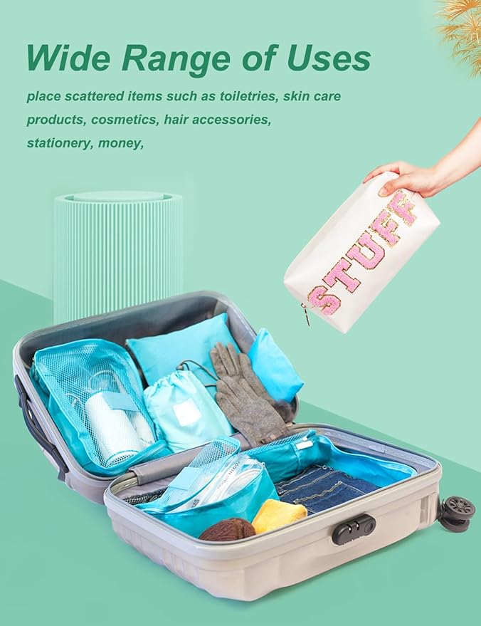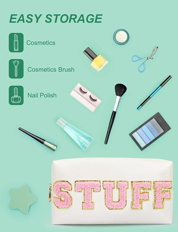 - ★GLITTER LETTER DESIGN - The patch makeup bag features vibrant "STUFF" chenille letters with gold trim on one side, securely sewn onto the bag for long-lasting appeal