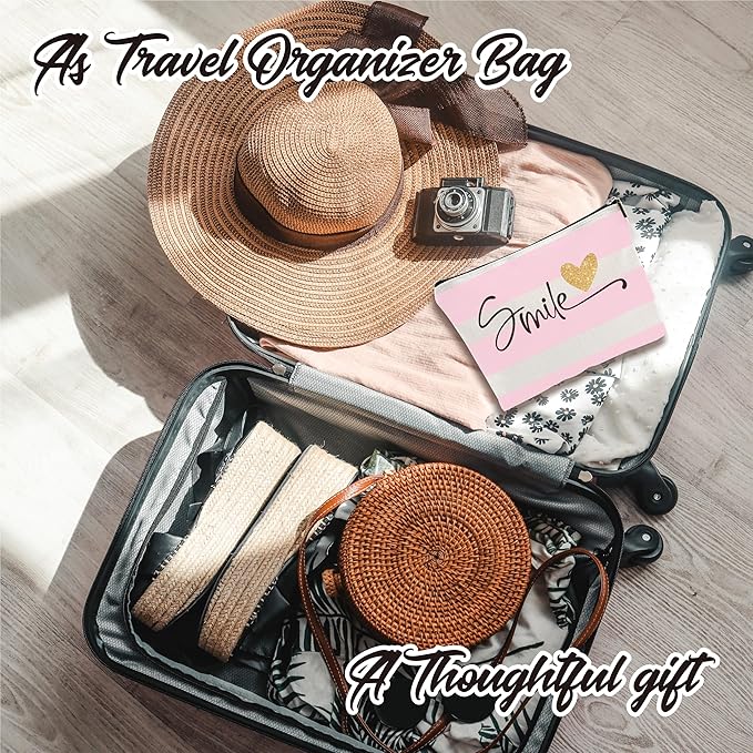 Stripes Makeup Bag - Smile - Heart Print Cosmetic Bag, Pink & White Toiletry Bag, Gift For Girls, Besties, Personal Care & Accessories - A29