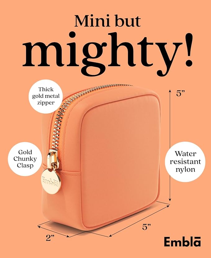 - Compact and Lightweight Cosmetic Bag – The Embla mini travel makeup bag measures 5 x 4.75 x 2 inches making it the perfect size to carry and organize all of your beauty essentials including your makeup, make up brushes, eye liner, hair ties, lip gloss, perfume and other items, while small enough to easily carry in your purse, tote, gym bag, shoulder bag, backpack or pack in a carry on suitcase. Great makeup pouch for travel or daily use.