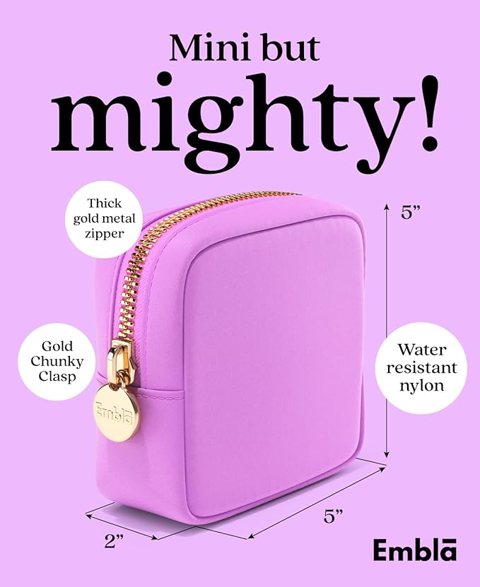 - Compact and Lightweight Cosmetic Bag – The Embla mini travel makeup bag measures 5 x 4.75 x 2 inches making it the perfect size to carry and organize all of your beauty essentials including your makeup, make up brushes, eye liner, hair ties, lip gloss, perfume and other items, while small enough to easily carry in your purse, tote, gym bag, shoulder bag, backpack or pack in a carry on suitcase. Great makeup pouch for travel or daily use.