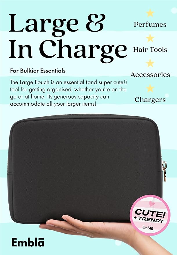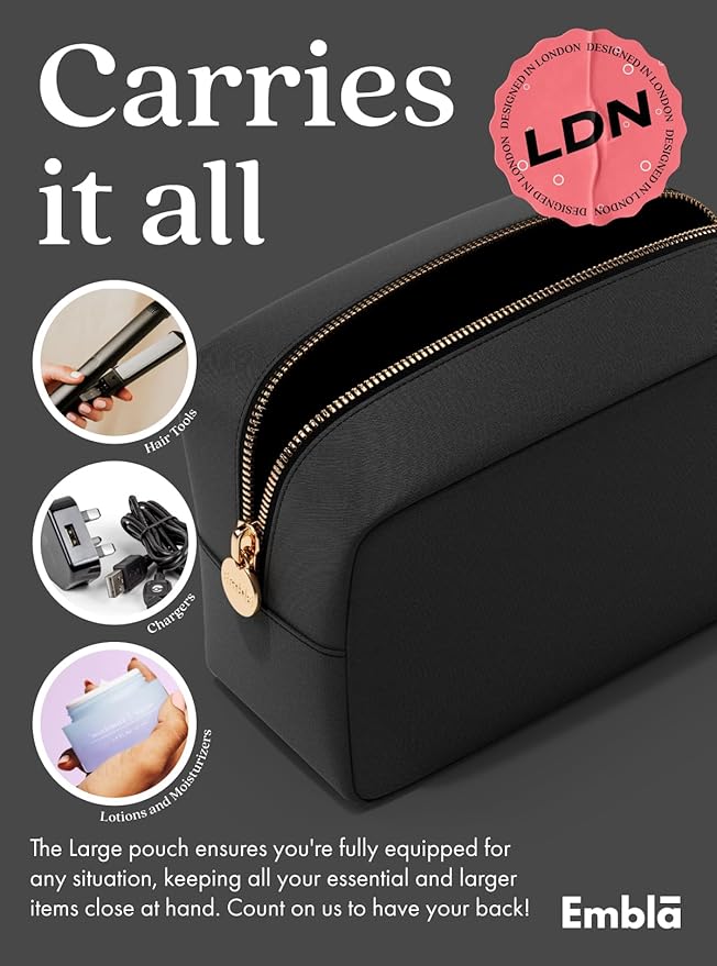 - Large Capacity Cosmetic Bag – The Embla Large Cosmetic Makeup Bag measures 11 x 8.5 x 5 inches making it large enough to carry and organize all of your beauty essentials including all of your makeup, hair brushes, make up brushes, eye liner, hair ties, perfume and other items. Great makeup pouch for travel or daily use.