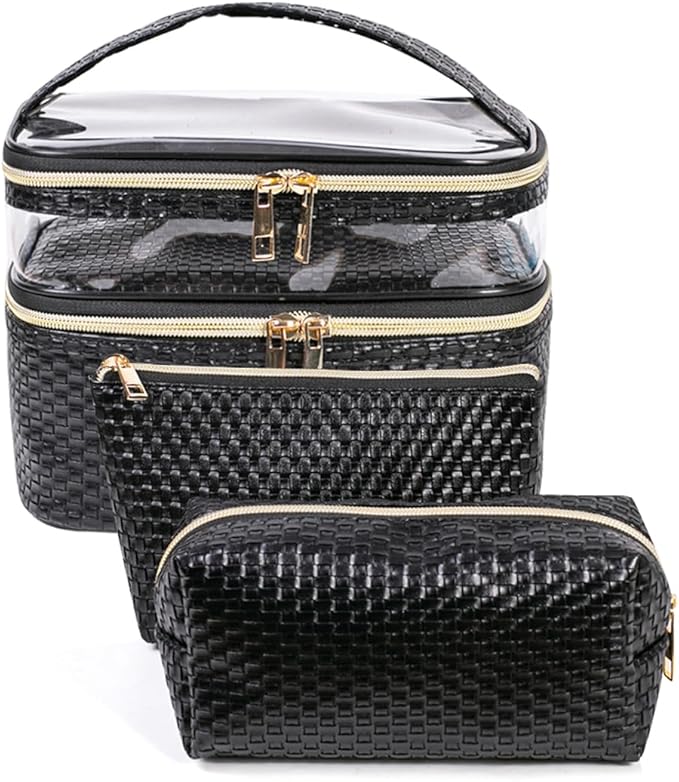 FITINI 3 Pieces Makeup Bags Double Layer Travel Large Cosmetic Cases Organizer Toiletry Bags Waterproof Small Zipper Pouch for Women Makeup Brush Storage Bag,Black Woven Pattern