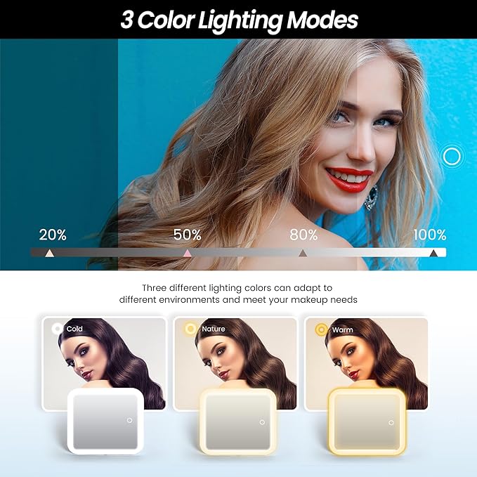 - 🪞【Lighted Makeup Case with 3 Light Modes】- Lighted makeup case includes a 9.1*7.86" 4K lighted travel mirror with 360° rotating bracket, Long press the switch can adjust light brightness from 0% to 100%, and gently touching the switch can easily adjust color temperature between cold light, natural light and warm light, whether you're applying sophisticated party makeup, commute makeup or everyday makeup.