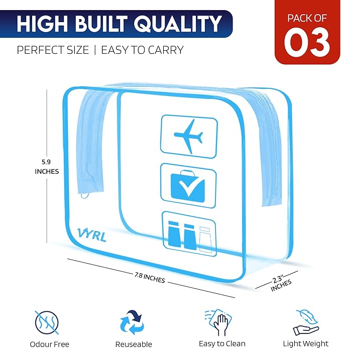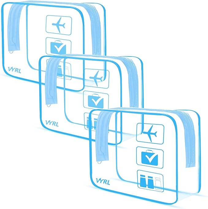 - ๐ฅ๐ง๐ฆ๐-๐๐ฝ๐ฝ๐ฟ๐ผ๐๐ฒ๐ฑ: VYRL 8.46 x 6.3 x 1.18 inches clear travel bags for toiletries strictly adhere to the TSA 3-1-1 liquids rule. The quart-size transparent clear cosmetic bag design ensures a swift pass through airport security & easily spot your essentials in a breeze.