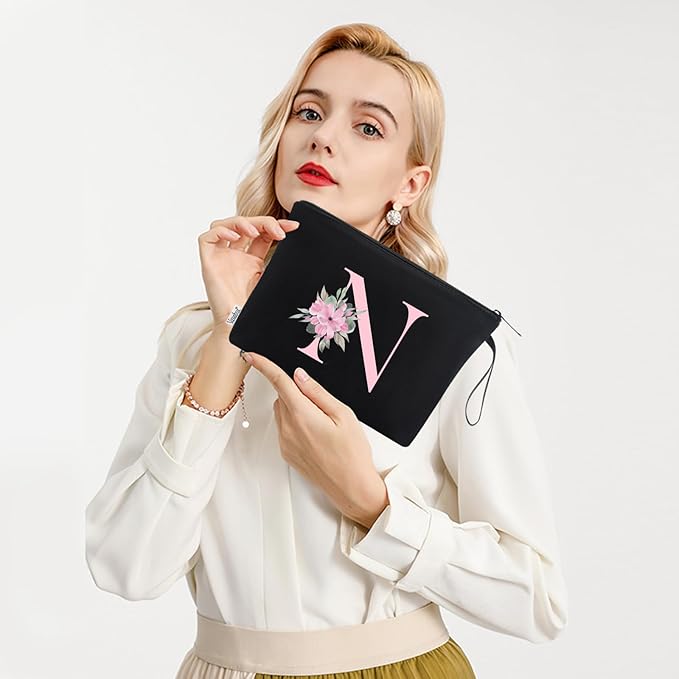 Vavabox A-Z Personalized Makeup Bag, Birthday Gifts for Women Mom, Gifts for Best Friend, Bride Bridesmaid Cosmetic bag (N, Black)